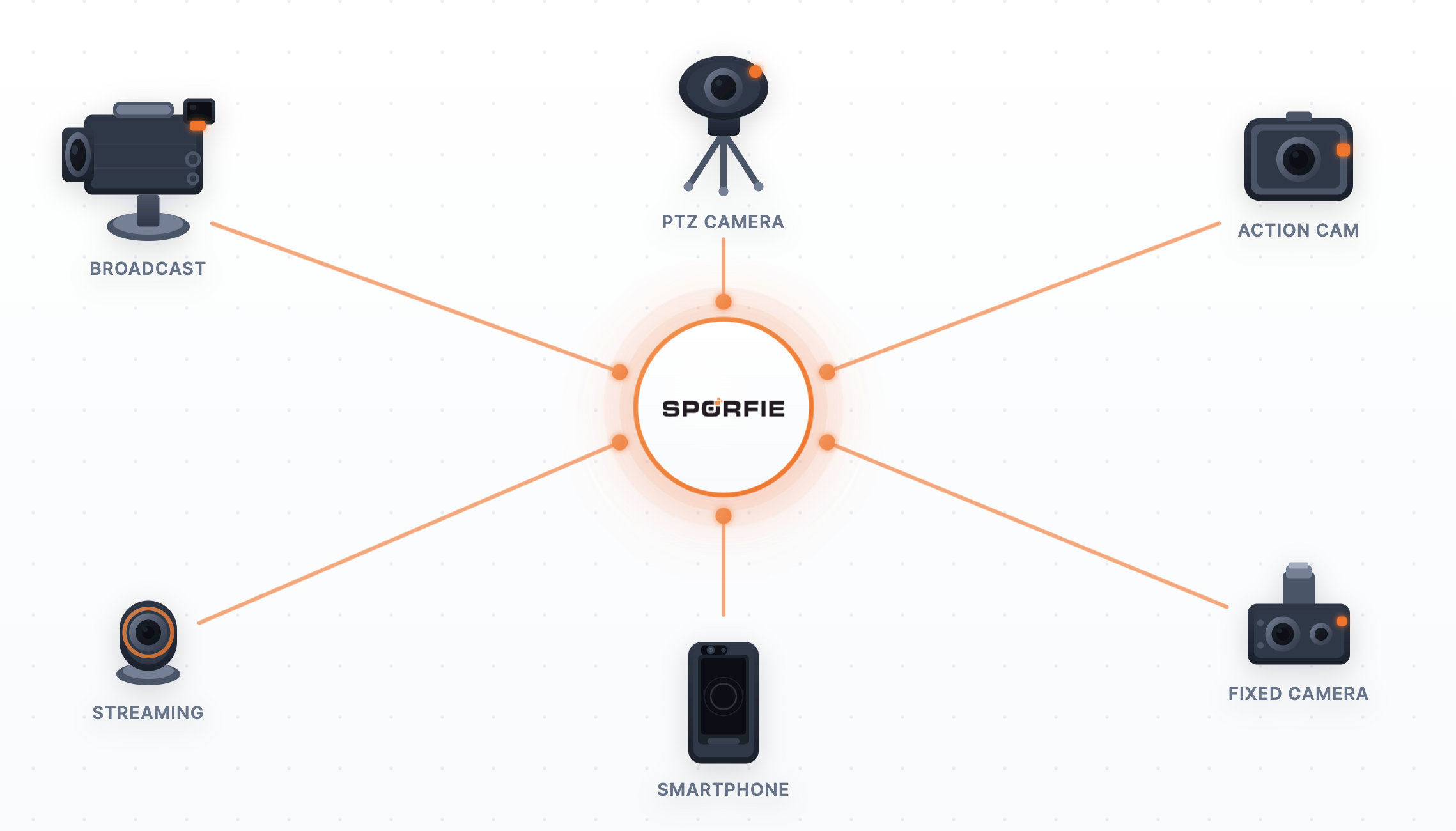 Beyond the smartphone, you can connect external cameras for even higher quality. Sporfie supports any device with RTMP or SRT protocol.